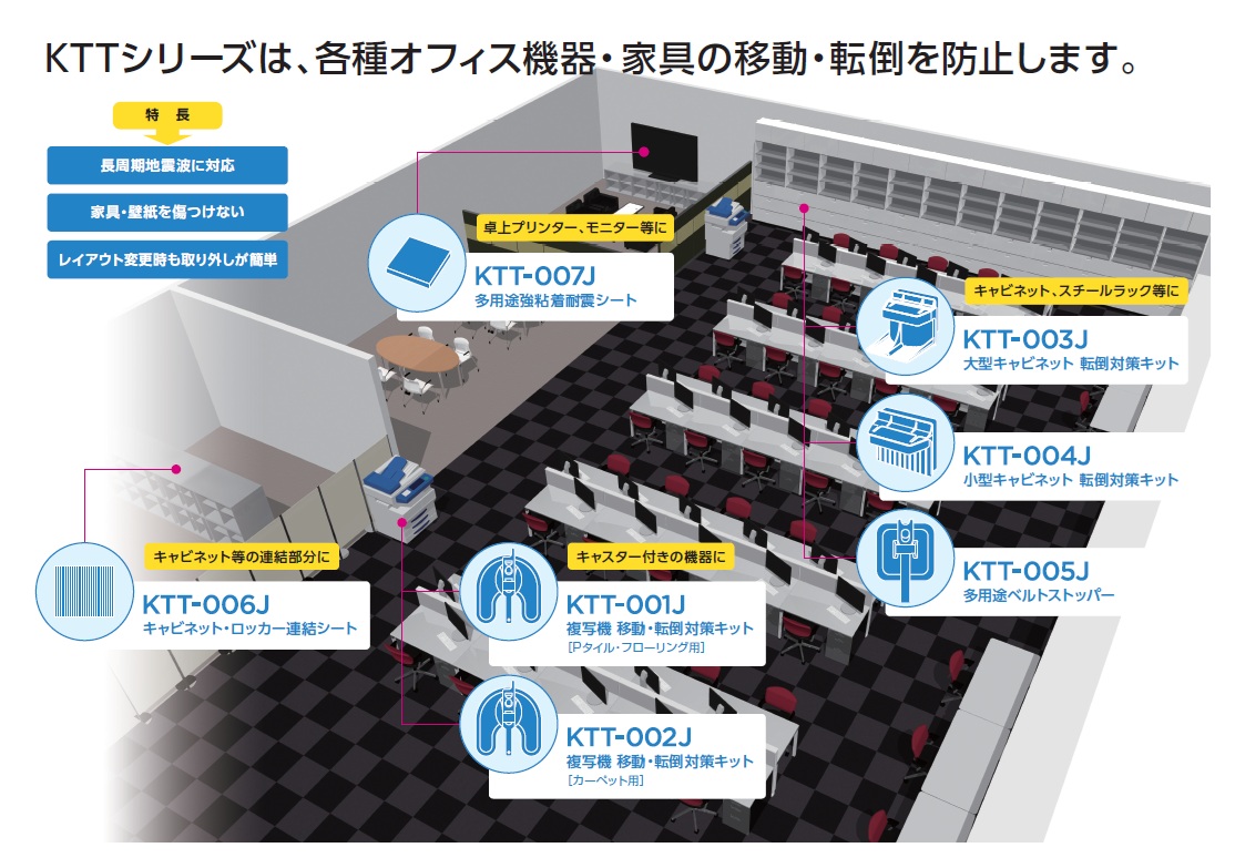 【制震オフィス】とは、「ダンパー機能付制振器具」を用いることにより、建物から伝わる地震エネルギーの振動を吸収し、複写機等のオフィス家具類の移動・転倒を最小限に抑えることを目的としたオフィス内の制震化を指します。